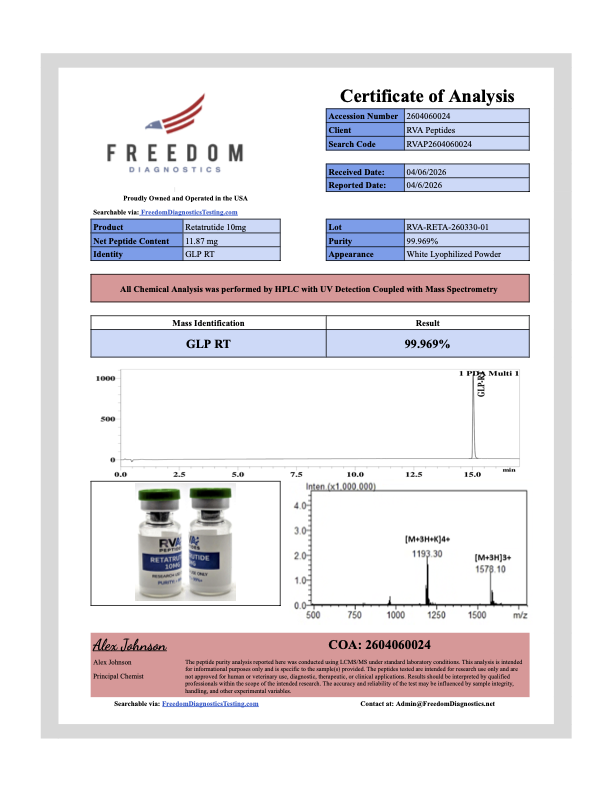 All products offered by RVA Peptides are third-party tested for identity and purity. Batch-specific Certificates of Analysis (COAs) are provided for transparency and research verification purposes only.